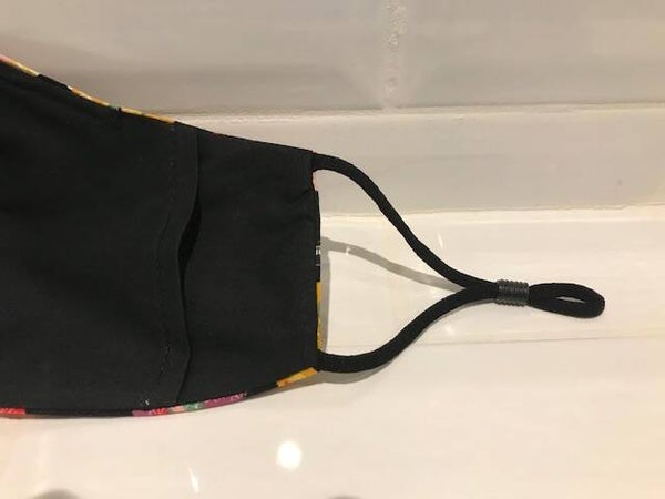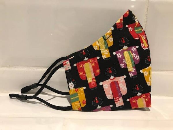 Mondkapje van 100% katoen, zwart met print van gekleurde, grafische geisha's. Met verstelbaar elastiek achter de oren, een ijzerdraadje om op de neus te klemmen en een opening aan de binnenkant om een filter in te plaatsen.