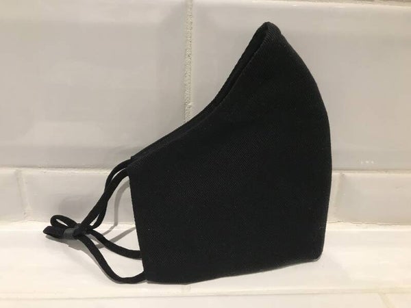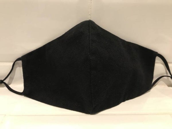 Mondkapje van 100% zwarte katoen. Met verstelbaar elastiek achter de oren, een ijzerdraadje om op de neus te klemmen en een opening aan de binnenkant om een filter in te plaatsen.