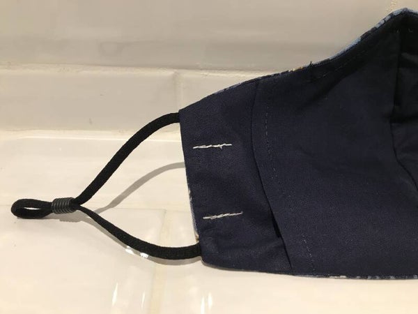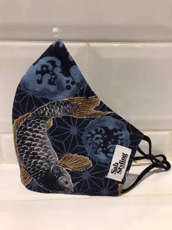 Mondkapje van 100% katoen, blauwe Japanse print met Koi-karpers. Met verstelbaar elastiek achter de oren, een neusclip om op de neus te klemmen en een opening aan de binnenkant om een filter in te plaatsen.
